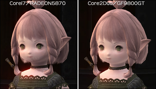 Core2Duo機(下)は、キャラや背景の境界線がガタガタしていて、手間の花もかなり省略されています。